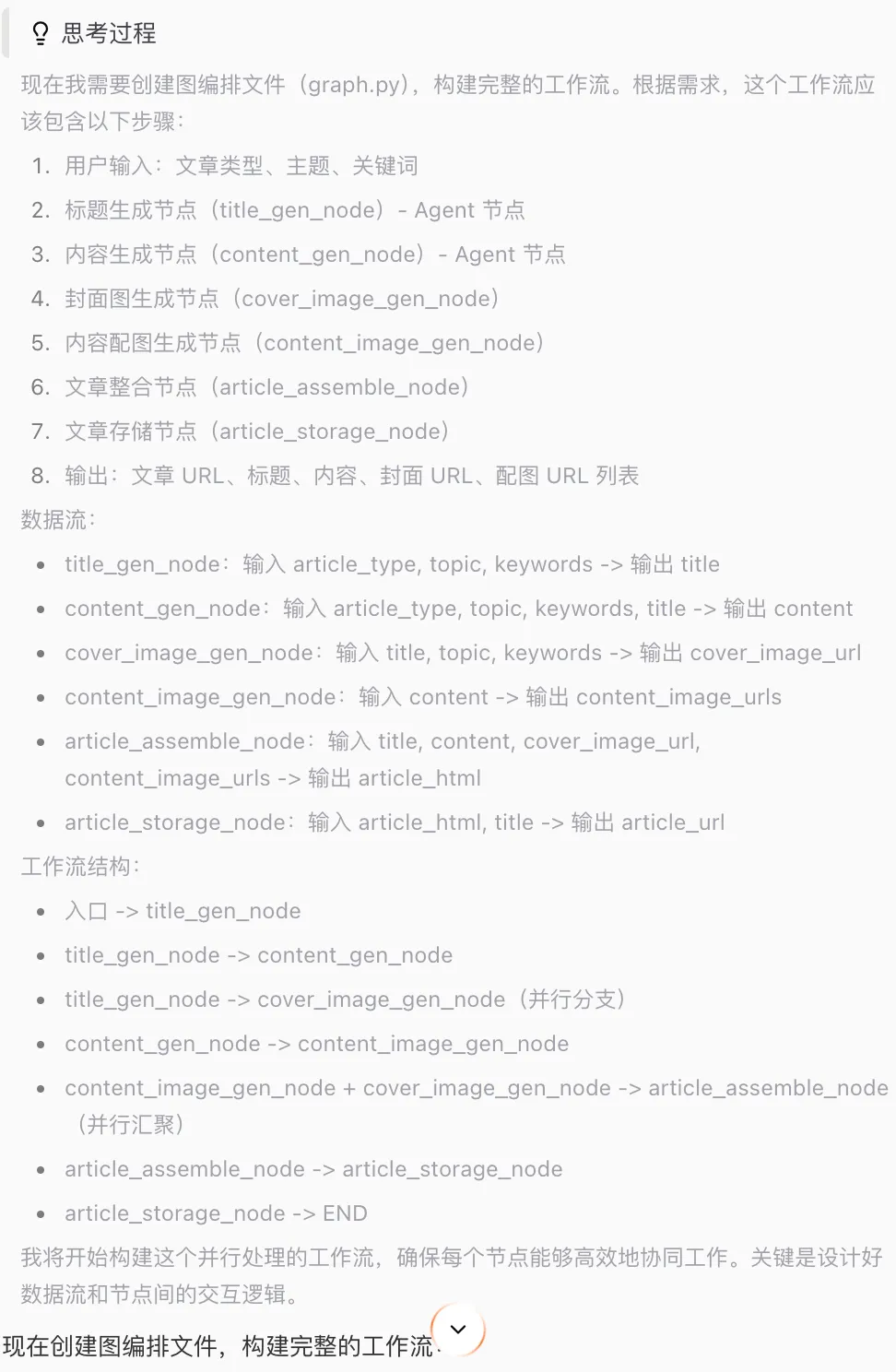 在工作流模块下,这是一个对话形式的,我们输入我们要创建工作流的需求描述,如:"实现一个通用的公众号文章生成工作流,收集用户输入的文章类型、主题、关键词,生成高质量的文章标题和内容,并生成对应的封面和内容配图(对象存储URL),最终结果完整的文章URL,复制URL可查看和下载"。