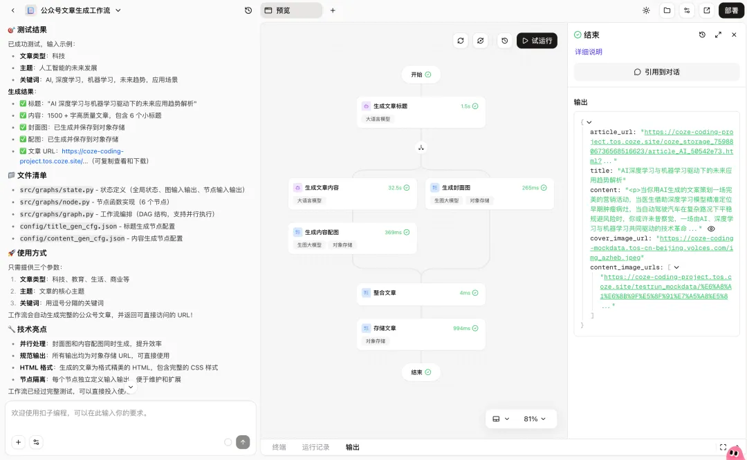 点击“试运行”,输入测试参数(如文章类型:科技,主题:人工智能的未来发展,关键词:AI, 深度学习,机器学习,未来趋势,应用场景),查看各节点运行状态,以及会有输出结果。