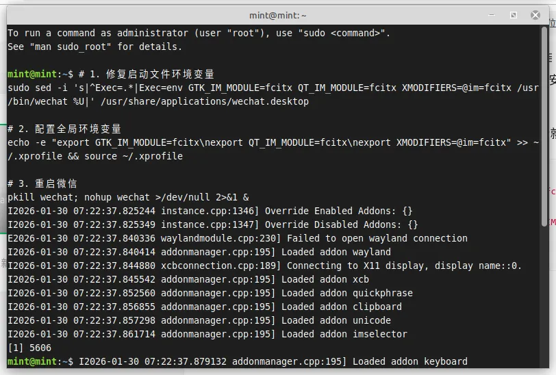 刚刚发布的linuxmint22.3cinnamon中文版,有朋友反馈安装微信后不能输入中文,如下是解决办法:打开终端,然后复制如下所有命令内容,粘贴进终端,直接回车执行就可以# 1. 修复启动文件环境变量sudo sed -i 's|^Exec=.*|Exec=env GTK_IM_MODULE=fcitx QT_IM_MODULE=fcitx XMODIFIERS=@im=fcitx /usr/bin/wechat %U|' /usr/share/applications/wechat.desktop# 2. 配置全局环境变量echo -e "export GTK_IM_MODULE=fcitx\nexport QT_IM_MODULE=fcitx\nexport XMODIFIERS=@im=fcitx" >> ~/.xprofile && source ~/.xprofile# 3. 重启微信pkill wechat; nohup wechat >/dev/null 2>&1 &