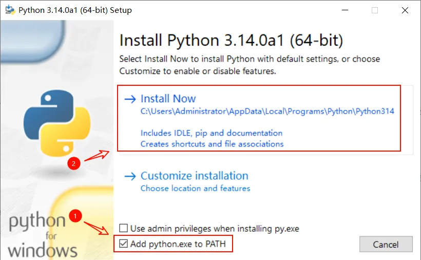 Add python.exe to PATH,这个一定要打勾,不然后面没法在命令行直接运行 Python;第二个是点击Install Now进行安装