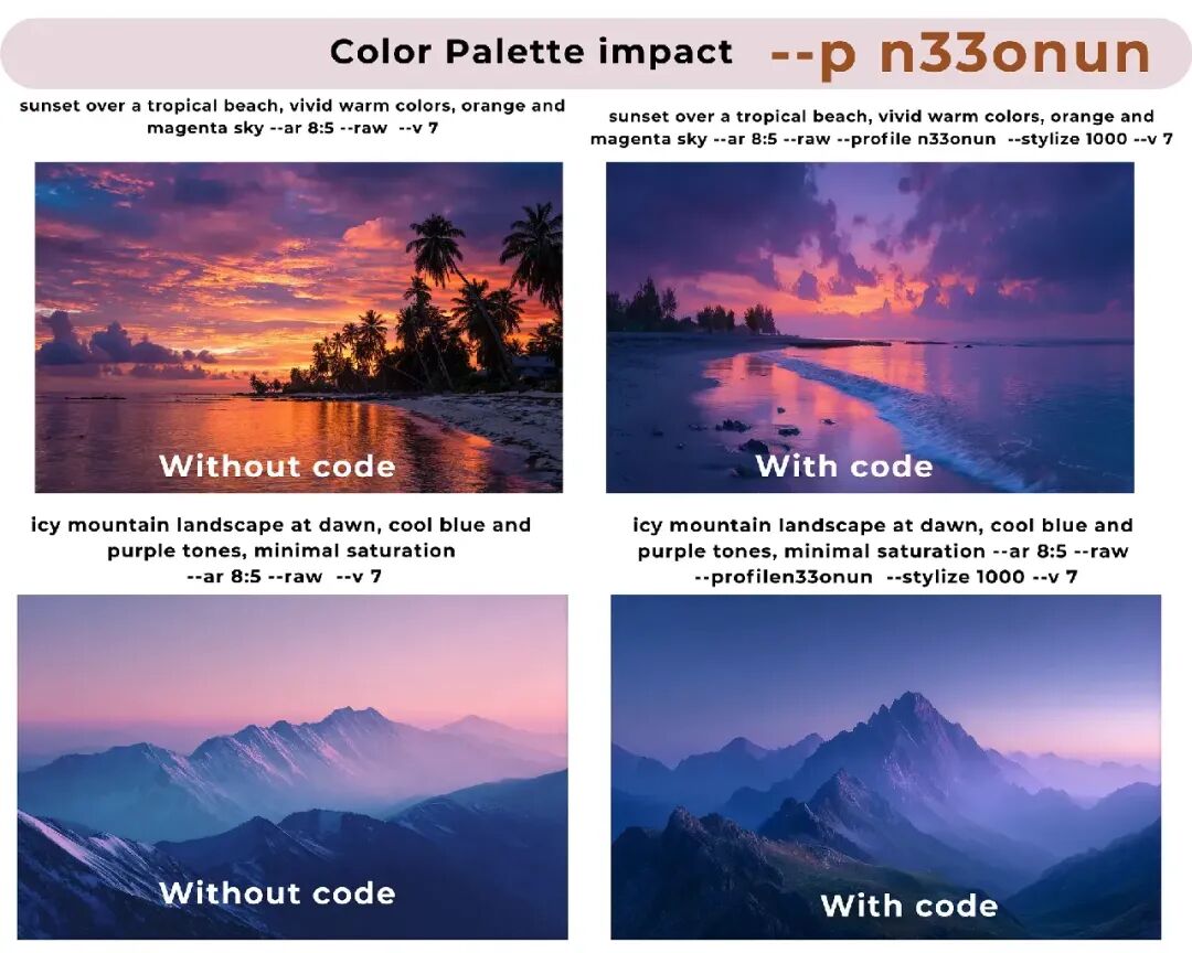 👉未使用代码= 平衡、写实的色彩,带有温暖自然的渐变。👉使用代码= 强化的紫-青-洋红(violet-cyan-magenta)色调,带有冷冽的霓虹底色。这是一个非常显著的效果。--p n33onun代码覆盖了 Midjourney 默认的色彩逻辑,采用了一种统一的、风格化的调色板,偏向紫色、粉色和柔和的霓虹蓝。更冷峻、更具情绪感:自然的暖意被风格化的冷感所取代。持续的偏紫/蓝色移:即使在阳光充足的区域,色调也偏向合成色。跨环境的统一性:从海洋到天空再到岩石,万物都遵循这一连贯的光谱。光影温度对比减弱:夕阳的黄色和橙色被压抑或重新诠释。更具电影感而非写实感:它唤起的是奇幻梦境,而非自然主义。👉这个个性化代码改变了整个调色板的情感基调——从自然主义的温暖转向风格化的宁静。👉非常适合:未来主义场景、电影感环境或情绪驱动的自然作品。🎯 最终结论