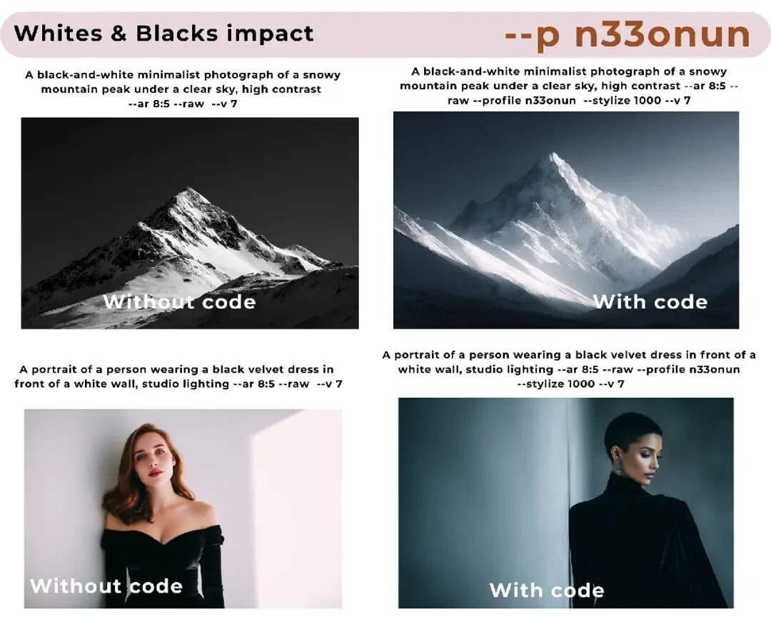 👉未使用代码= 逼真的对比度,拥有自然的光线衰减和中性色调。👉使用代码= 加深的黑色,带有银蓝色调的明亮白色,以及高对比度的戏剧张力。--p n33onun代码引入了一种高度电影化的黑白影调处理,即使在全彩图像中也是如此。它重新定义了对比度,不仅通过光影,更通过情感的重量。戏剧性的深沉:黑色更哑光、更极致(crushed),且富含阴影层次。带有电影质感的颗粒:就像风格化的杂志摄影或黑色时尚大片。高度定向性:光线感觉是雕刻出来的、戏剧化的,而非环境漫反射。👉该代码将中性光照转向风格化的“冰冷对比”,黑色更浓密,白色散发着寒意。👉最适合:时尚、肖像、高戏剧性的风景或情绪化的杂志大片场景。🎯 最终结论