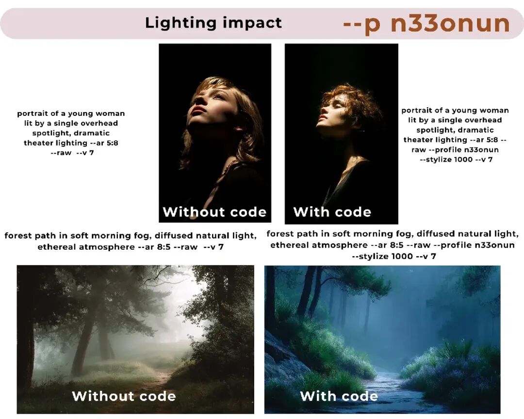 👉未使用代码= 自然主义照明,带有环境渐变和逼真的漫射。👉使用代码= 风格化的聚光灯效果、空灵的光晕和戏剧性的对比区。由--p n33onun引入的光线变化在视觉上是大胆且电影化的。它强调定向光、超现实的氛围和情感色调,而非现实主义。更具定向性和戏剧性:聚光灯、轮廓光(rim lights)和光环效应被强化。色调更冷:温暖的阳光和黄金时段的光线转向冰蓝和紫色的光晕。雾气和氛围增强:漫射光在雾气或重雾场景中绽放,带有梦幻般的朦胧感。主体分离:光线被用来戏剧性地框定中心主体,就像舞台或电影布光。情绪优先,写实第二:该代码优先通过照明进行视觉叙事。👉这个个性化代码将自然场景转化为“视觉受控的氛围”,就像奇幻电影或戏剧性杂志内页的场景。👉最适合:肖像、情绪化的自然风光、夜间奇幻或概念环境。🎯 最终结论