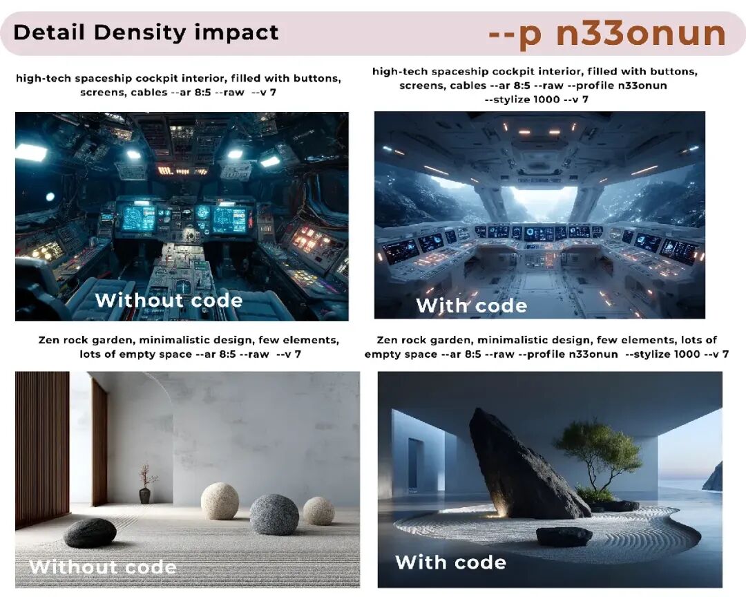 👉使用代码= 超级增强的视觉复杂性,增加的物体分层,以及放大的微观细节。--p n33onun代码即使在极简设置中,也通过提高清晰度、灯光强调和物体密度感知,增加了感知的视觉复杂性。通过光线放大:微妙的纹理和设计元素通过更强的对比度被揭示出来。即使在稀疏场景中也更致密:极简构图变得在纹理上引人入胜,而不会显得杂乱。布局更具电影感:细节被编排以引导视线穿过各个平面。克制感降低,非写实:场景感觉比自然合理的“更多”,就像经过后期处理的渲染图。👉这个代码倾向于通过视觉丰富性来表现“复杂性”,即使在平静的环境中也是如此。👉完美适配:科幻内饰、概念艺术、奢华建筑和杂志风格的环境。🎯 最终结论