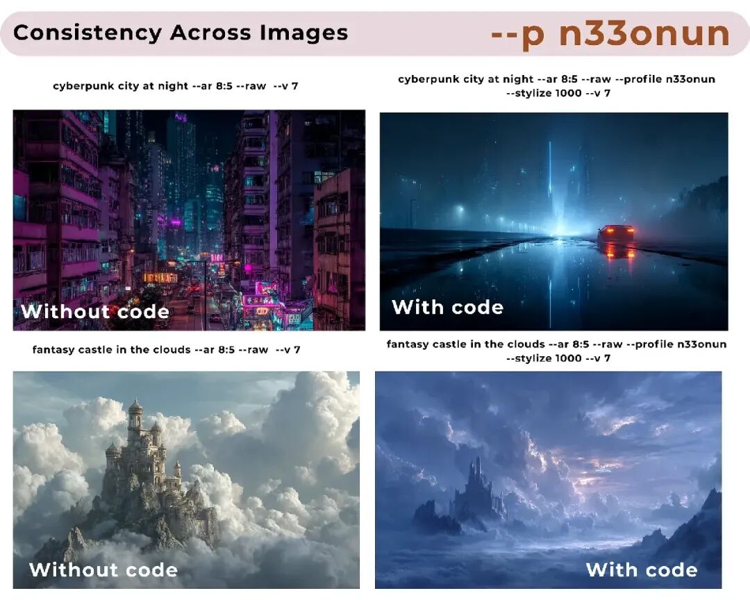 👉未使用代码= 风格根据提示词类别、光线或写实水平而变化。👉使用代码= 跨越不同提示词的强大统一特征,冷色调,柔光,风格化的深度。尽管主题发生了巨大变化(城市街道、哥特式城堡、赛博朋克、奇幻),--p n33onun代码在所有输出上都强加了一个可识别的审美指纹。凝聚的色彩语言—— 即使跨越不同流派,也倾向于紫色、蓝色和洋红色调。标志性的光影情绪—— 所有场景中都存在柔光高光、环境雾气或光晕。共享的对比度轮廓—— 黑色电平和白色保持一致的风格化。大气的柔和感—— 边缘与光线和雾气融合;为了色调而平滑了写实感。视觉叙事基调—— 无论是现代还是中世纪,情绪都感觉是电影化和空灵的。👉这个代码就像一个“通用滤镜”,将独特的风格覆盖在截然不同的主题上。👉特别有用:当生成系列作品或品牌美学时——视觉和谐得以保留。🎯 最终结论