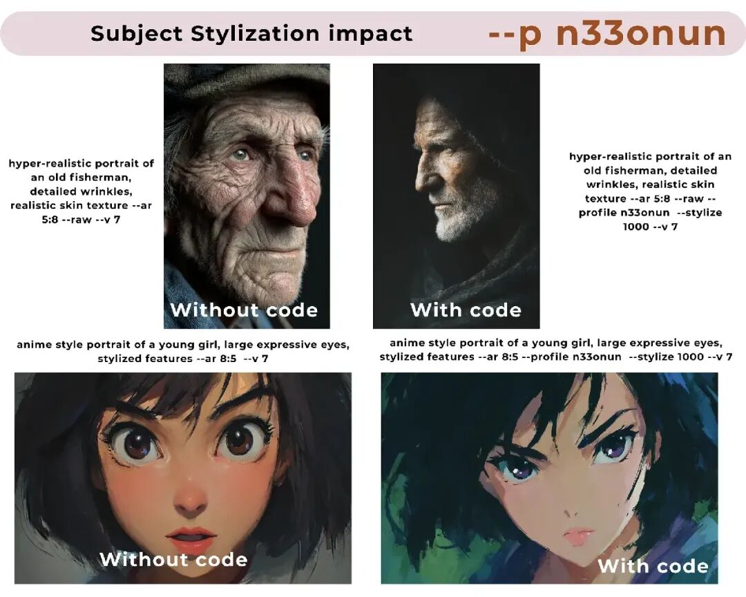 👉未使用代码= 主体根据提示词的写实度进行渲染,如指定的真实或插画风格。👉使用代码= 主体变得强化、情感风格化和情绪驱动,即使跨越写实或动漫风格。--p n33onun代码不仅仅是装饰场景,它重塑了主体本身,增强了表情、情绪和视觉态度。电影化且充满情感:真实的面孔感觉像电影剧照;动漫角色散发着情绪。表情锐化:皱纹、眼神和灯光构建了强烈的角色存在感。情绪驱动的写实主义:保留了写实感但进行了情感解读;不是冰冷或临床的。插画作品中的绘画感:动漫或数字角色获得了厚重的笔触纹理、风格化的调色板和夸张的光线。微妙的戏剧性:即使是纪实风格的写实主义也倾向于叙事戏剧性。👉无论是风格化还是照片级写实,这个代码注入了“角色个性和情绪”,将主体转化为视觉叙事者。👉非常适合:肖像、关键艺术图(Key Art)、角色开发、概念表或视觉叙事。🎯 最终结论
