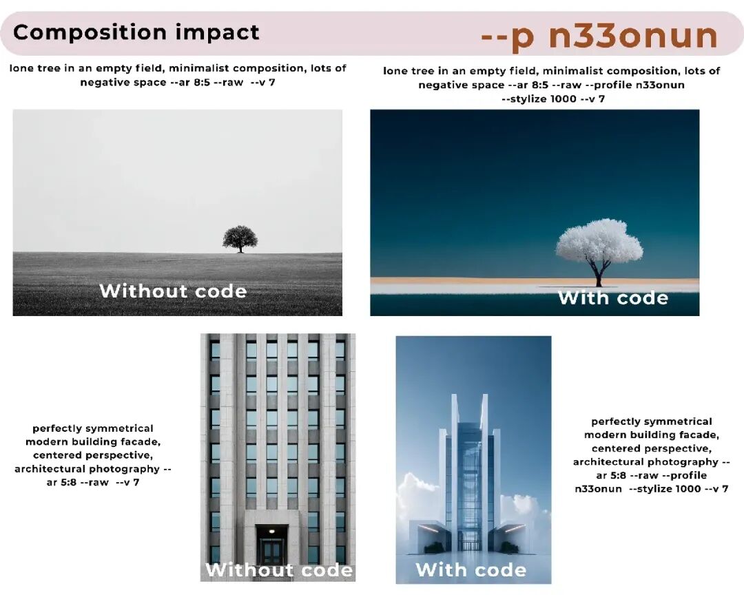 👉未使用代码= 基于提示词语境的平衡构图——居中、极简或建筑对称。👉使用代码= 电影式构图,强调三分法,深度的透视分层。--p n33onun代码微妙地重塑了 Midjourney 构建视觉平衡的方式,借鉴了电影语言和风格化的对称性。它将平庸的构图提升为有意图的、故事驱动的布局。电影化和戏剧性:深远的消失点、宽画幅比例和舞台般的安排。对称性增强:中心主体(树木、建筑物)感觉是刻意“被框定”的,而非偶然放置。前景-背景对比:关键主体与氛围空间之间有强烈的空间分层。带有情绪的极简主义:即使在稀疏的设置中,每个元素都经过精心构图以承载情感重量。几何作为叙事:窗户的重复、天际线的对称和地平线的放置都感觉有目的性。👉这个代码表现得像一位“视觉导演”,通过结构、平衡和深度引导观众的焦点。👉最适合:建筑渲染、视觉叙事、极简超现实主义或设计感强的图像。🎯 最终结论