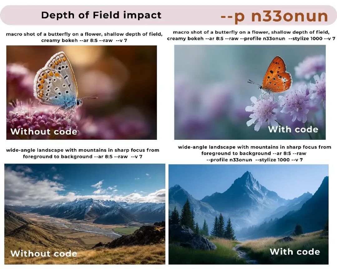 👉未使用代码= 由相机逻辑驱动的逼真景深(微距=浅景深,风景=深景深)。👉使用代码= 风格化、电影感的景深,带有增强的模糊渐变和受控的柔和度。--p n33onun代码为焦点的处理增加了精度和情绪。它选择性地锐化重要的东西,柔化辅助的东西,打造出一种感觉经过策展的视觉层次。微距中更明显:前景主体(如蝴蝶)锐利如刀,背景呈奶油状、绘画感。风景中的背景柔化:即使是深焦距场景,远处于也获得了微妙的雾气或光晕。渐变丰富:从锐利到柔和的过渡感觉平滑、大气且富有情感。焦外散景(Bokeh)增强:模糊区域的光线获得美学光晕,特别是在特写或花卉场景中。情绪优先的焦点:景深服务于情感基调和视觉戏剧性,而非技术写实主义。👉 这个代码将“电影摄影师的视角”应用于图像深度。清晰度变成叙事,柔和度变成情感。🎯 最终结论