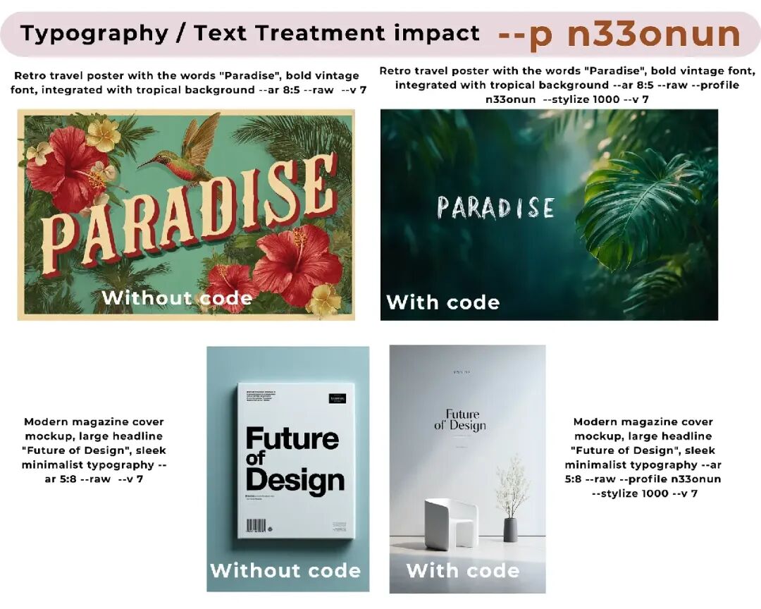 👉未使用代码= 字体根据提示词表现——干净的杂志风、清晰的品牌风或装饰性风格。👉使用代码= 字体获得性格:纹理叠加、阴影深度、复古色调或手绘情绪。在--p n33onun作用下,排版通常变成艺术的一部分,而不仅仅是功能性文本。有纹理和触感:复古海报显示出颗粒、磨损或笔刷痕迹。与场景风格融合:排版感觉属于该情绪(例如,热带、杂志、自然主义)。电影化和提升感:投影、渐变和微妙的斜面增强了立体感。偶尔的绘画感:在自然场景中,文字模仿墨水或粉笔等有机介质。中性度降低:在设计优先的案例中,它可能会轻微风格化字距、色彩平衡或易读性。👉文字不仅仅是叠加,它被风格化以“匹配情感基调”、氛围和视觉和谐。👉最适合:海报、书籍封面、品牌叙事、怀旧外观或表现力强的标题艺术。🎯 最终结论