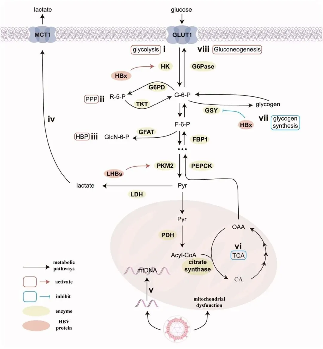 HBV 策略性地重编程宿主葡萄糖代谢以支持病毒复制和持续存在,主要通过劫持糖酵解(包括 TCA 循环)、磷酸戊糖途径 (PPP) 和己糖胺生物合成途径 (HBP)(图 1 i-iii)。在正常生理条件下,在有氧条件下,大部分葡萄糖经历氧化磷酸化 (OXPHOS) 在有氧条件下 (Cooper and Adams, 2009),但 HBV 感染诱导了类瓦博格转变——尽管有氧气可用,病毒诱导宿主细胞优先进行有氧糖酵解 (Koppenol et al., 2011; Dayton et al., 2016)。