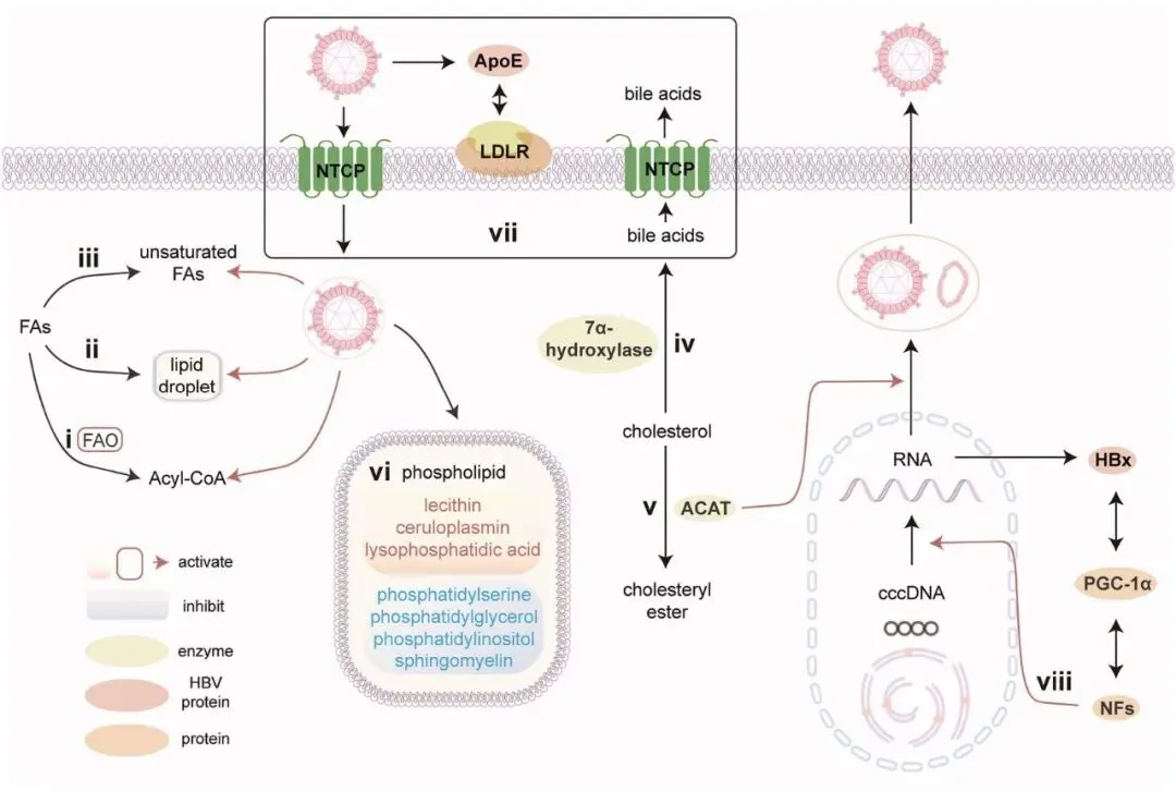 HBV 在其生命周期的多个阶段,特别是病毒进入和组装,严重依赖胆固醇,这一点在膜胆固醇耗竭后感染性显著降低中得到证明 (Bremer et al., 2009; Pollock et al., 2010)。最近的研究表明,抑制酰基辅酶 A:胆固醇酰基转移酶 (ACAT),一种胆固醇酯化的关键酶,具有三重治疗益处:直接抑制 HBV 颗粒生成,通过脂质代谢重编程(减少中性脂滴同时增强 TCR 信号传导)恢复耗竭的 T 细胞功能,并与程序性死亡受体 1 (PD-1) 阻断剂协同作用,重振抗病毒免疫力 (Schmidt et al., 2021)(图 2 v)。HBV 可能通过氧化的胆固醇衍生物来操纵胆固醇代谢,这些衍生物激活肝 X 受体 (LXR) 核受体以促进病毒转录 (Kim et al., 2011; Cui, M. et al., 2014)。矛盾的是,尽管 HBV 利用胆固醇进行复制,但恢复胆固醇稳态可以通过改善树突状细胞功能来增强抗病毒免疫力 (Zhao et al., 2022),突显了病毒需求与宿主防御之间复杂的相互作用。此外,HBV 通过上调胆固醇 7α-羟化酶(图 2 iv)和调节钠-牛磺胆酸共转运多肽 (NTCP) 受体(图 2 vii)(Geier, 2014; Oehler et al., 2014),深刻地改变了胆汁酸代谢,创造了额外的代谢弱点,这些弱点可能成为治疗靶点。
