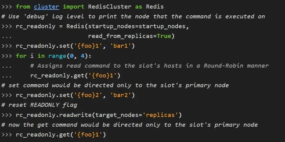 >>> # target-nodes: the node that holds 'foo1's key slot>>> rc.set('foo1', 'bar1')>>> # target-nodes: the node that holds 'foo2's key slot>>> rc.set('foo2', 'bar2')>>> # target-nodes: the node that holds 'foo1's key slot>>> print(rc.get('foo1'))b'bar'>>> # target-node: default-node>>> print(rc.keys())[b'foo1']>>> # target-node: default-node>>> rc.ping()