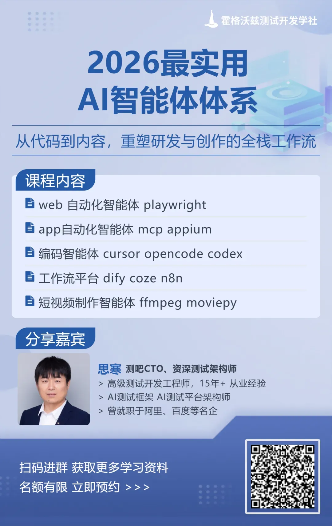 // test-data/loginData.jsexportconst loginTestData = [ { userType: 'ADMIN', expectedRole: '管理员' }, { userType: 'EDITOR', expectedRole: '编辑' }, { userType: 'VIEWER', expectedRole: '查看者' },];// 测试文件test.describe('不同角色登录', () => {for (const data of loginTestData) { test(`${data.userType}用户登录后显示正确角色`, async ({ page }) => {const dashboard = await loginAsUser(page, data.userType);await expect(dashboard.roleBadge).toContainText(data.expectedRole); }); }});伙伴们,对AI测试、大模型评测、质量保障感兴趣吗?我们建了一个 「Playwright mcp技术学习交流群」,专门用来探讨相关技术、分享资料、互通有无。无论你是正在实践还是好奇探索,都欢迎扫码加入,一起抱团成长!期待与你交流!👇