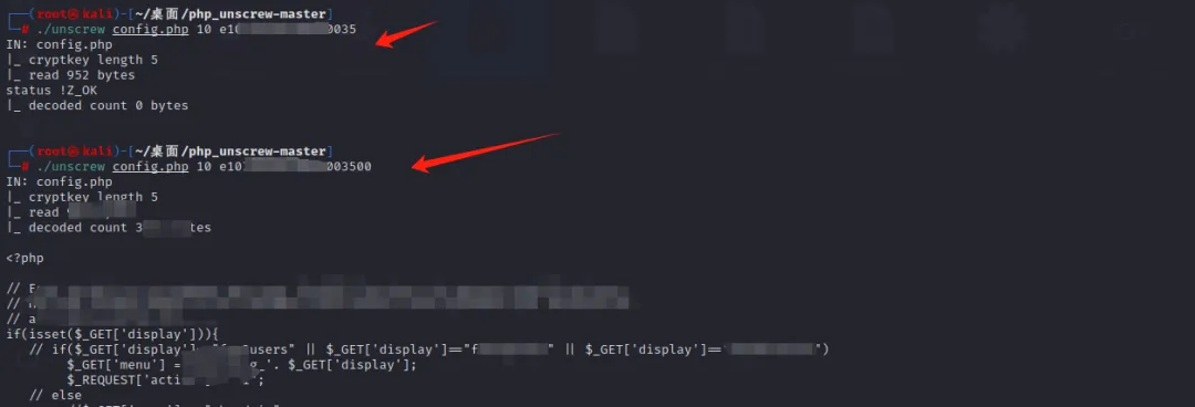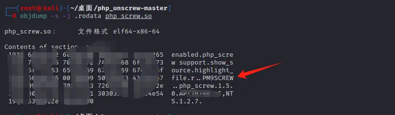 完全没法看,而后在设备里找到了php_screw.so文件,这个文件里存放了key和头长度,这两个是用来后去解密的,key可以直接使用ida打开so文件直接查看通过查看hex获得十六进制的密钥,但是这里很奇怪,脚本里写的是从开头到第一个空字节结束,但是我遇到的这个需要加上00才行https://github.com/DaBoQuan/php_unscrew
