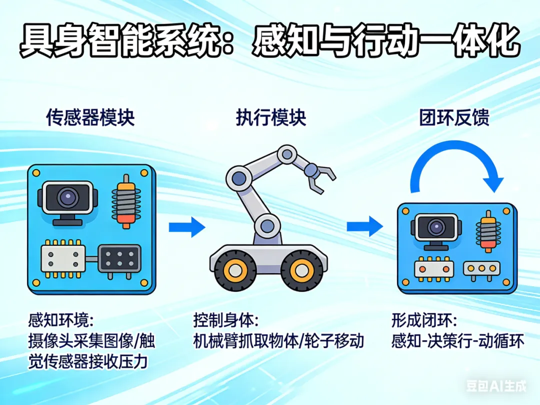 具身智能系统通过传感器(如摄像头、触觉传感器)感知环境,并控制身体(如机械臂、轮子)做出反应,形成闭环。