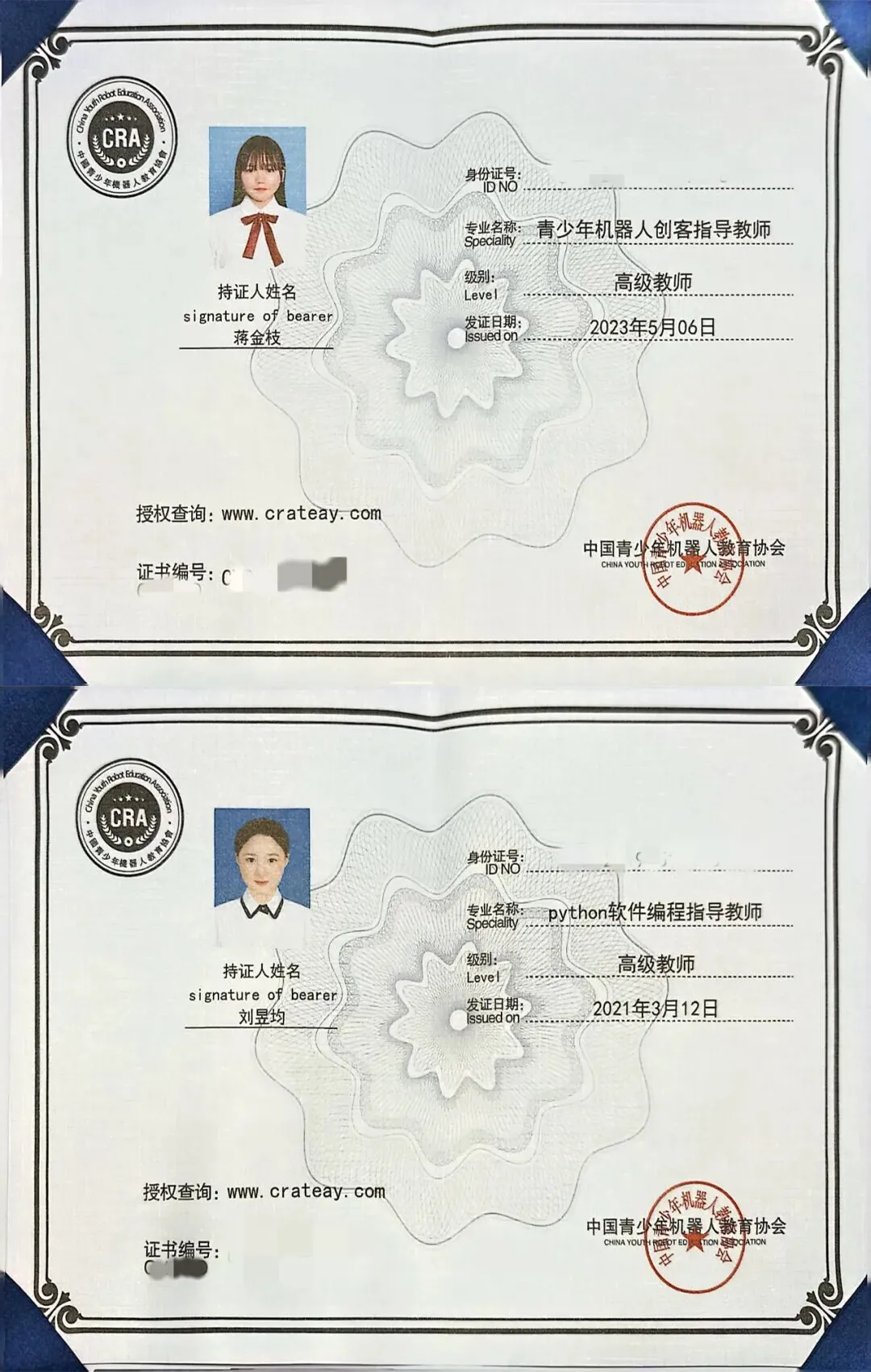 普通话二甲证书,持有高级中学教学资格证,北大附属实验学校外聘scratch编程教师,心湖小学瓦力编程拓展课教师