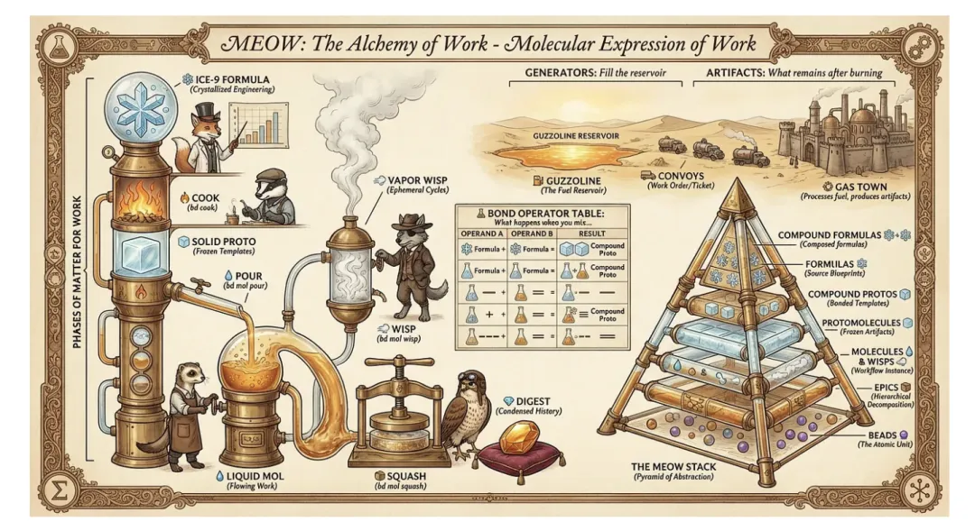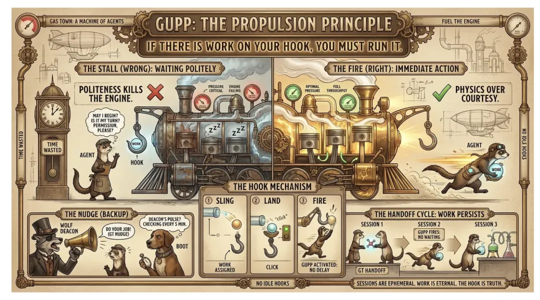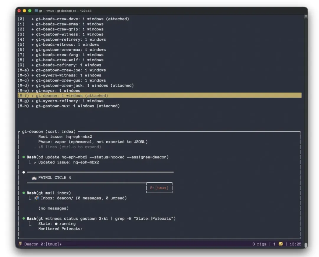 所以Claude Code是否崩溃或上下文耗尽并不重要。只要为此代理角色启动另一个会话,它将立即开始处理该分子中的步骤(通过GUPP,或当被某个巡逻代理推动时)。如果它发现它在最后一步中间崩溃了,没什么大不了的,它将找出正确的修复方法,执行并继续。所以即使路径完全是非确定性的,结果——您想要运行的工作流——最终完成,"保证",只要您不断向它投掷代理。代理甚至可能在此过程中犯错,但可以自我纠正,因为分子的验收标准大概由设计分子的人明确指定。有很多边缘情况。这个NDI描述是过度简化的。Gas Town不是Temporal的替代品。请咨询您的医生,Gas Town是否适合您。但Gas Town确实提供了对于开发工具足够好的工作流保证!如果您是我!我们的教科书中可能还有一些其他角落需要涉及。大多数时间,您不关心这些东西,您关心车队的启动和完成,以及观看您的活动源和仪表板。但Gas Town的分子"化学"有很多丰富的角落,在编排中积极使用。12月21日的一个关键扩展发明是轻雾(Wisps),它们是临时的Beads。它们在数据库中,获得哈希ID,并像常规Beads一样行动。但它们不写入JSONL文件,因此不持久化到Git。在运行结束时,轻雾被"燃烧"(销毁)。可选地,它们可以被压缩成单行摘要/摘要并提交到git。轻雾对于高速度编排工作流很重要。它们是Gas Town工作的气相。所有巡逻代理——精炼厂、见证者、执事、Polecats——为每个巡逻或工作流运行创建轻雾分子。它们确保工作流以事务方式完成,但不会用编排噪音污染Git。巡逻是巡逻工作者(特别是精炼厂、见证者和执事)运行的临时工作流。巡逻是代理循环运行的临时(轻雾)工作流。巡逻具有指数退避:如果代理在其巡逻步骤中找不到工作,它将逐渐进入睡眠状态,等待越来越长的时间才开始下一次巡逻。任何变异的`gt`或`bd`命令都会唤醒城镇,或者您可以用`gt`命令自己做,启动个别工作者、组、钻机或整个城镇。精炼厂的巡逻相当简单。它有一些预检步骤来清理工作空间,然后处理合并队列,直到它为空,或者需要回收会话。当它准备好交接时,其分子中有一些飞行后步骤。我正准备向精炼厂的巡逻添加插件,但它们还不存在。当我添加它们时,您将能够添加插件来干扰MQ并尝试智能地重新排序它,并将Gas Town的后端连接到其他系统。见证者的巡逻更复杂一些。它必须检查polecats和精炼厂的状况。它还窥探执事,只是为了确保它没有卡住。见证者运行钻机级别插件。执事的巡逻有很多重要的职责。它运行城镇级别插件,这些插件可以提供全新的UI或功能。执事还参与`gt handoff`和回收代理会话的协议,并确保一些工作者被正确清理。执事的巡逻变得足够复杂,以至于我添加了狗作为助手,执事的个人团队。现在它被提示将复杂工作和调查交给狗,以便长时间的巡逻步骤不会干扰城镇的核心事件系统,该系统是协作和基于邮件的。Gas Town将插件定义为"来自代理的协调或调度关注"。Gas Town工作者运行工作流(通常在巡逻循环中),任何工作流都可以包含任意数量的"运行插件"步骤。Gas Town的执事巡逻运行城镇级别插件,现在用狗运行,所以它们可以运行几乎无限的时间。我们对定时器和回调有一些支持,但主要是生命周期钩子。我还没有对这个子系统投入大量设计思考,所以如果您想开始使用插件系统,请告诉我,我们可以解决。我计划在Gas Town中实现大量附加功能作为插件。它们只是没有进入v1发布。它们可能最终成为Mol Mall中的公式。好的,呼。您做得很好。我们涵盖了很多理论,这尤其困难,因为它是我在过去3周从屁股里拉出来的一堆废话,我以獾等东西命名它。但它有一种优雅的一致性和连贯性。基于Git数据平面中黄色小便签的工作流编排,作为连接工作海洋中的图节点。呸!没人在乎,我知道。您想超级快速地完成任务,仅受限于您的令牌吸收速度。让我们谈谈如何实现。Gas Town中的所有工作,所有工作,都汇总到一个车队中。车队是一个特殊的Bead,它将一堆工作包装成一个您跟踪交付的单位。它不使用史诗结构,因为车队中跟踪的问题不是其子级——它们中的大多数已经有另一个父级。在Gas Town中抛掷工作的基本原语是`gt sling`。如果我告诉市长:"我们的tmux会话在状态栏中显示错误的钻机数量——提交它并抛掷它",市长将为问题提交一个Bead,然后`gt sling`它给一个polecat,后者立即处理它。真实示例:我经常告诉我的Beads船员将发布分子抛掷给一个polecat。Polecat将走过20步发布流程,完成它,然后我会收到通知车队已经着陆/完成。编辑:实际上现在甚至更花哨。当分子在门状态等待时,例如等待GH Action或CI/CD,polecat消失。然后当门Bead触发时,Gas Town唤醒一个polecat以继续工作。听到"问题`wy-a7je4`刚刚完成"会令人困惑。即使您看到标题,它可能并不反映该问题所属的更大工作块。所以现在我们用车队包装每一块抛掷的工作,从单个polecat抛掷到有人启动的大群集。车队出现在一个日益改进的仪表板中;有一个Charmbracelet TUI,带有每个车队的扩展树,所以您可以看到其个别跟踪的问题。UI和UX将改进。这是Gas Town的第一天。车队基本上是功能。无论是技术债务清理、实际功能还是错误修复,每个车队都是Gas Town工单架构的票据单位。它们相当新(可能3-4天?),但已经是最有趣的工作方式。请注意,车队在完成之前可以有多个群集"攻击"它(处理它)。群集
