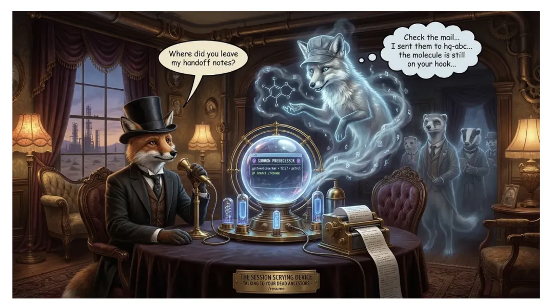 这两种工作都使用Beads,两者之间有一些重叠。大多数情况下,它相当灵活,您在何处提交问题或实例化工作并不重要。所有工作者都了解Gas Town,如果您从错误的钻机给它们工作,它们会相当冷静。所有钻机级别工作者(精炼厂、见证者、polecats和crew)在需要时完全能够跨钻机工作。有一个`gt worktree`命令,它们可以用来获取任何钻机的自己的克隆并进行修复。但通常它们在一个项目内工作。Beads有跨钻机路由。Gas Town配置Beads根据问题前缀(如"bd-"或"wy-")将`bd create`和`bd show`等请求路由到正确的数据库。所有Beads命令在Gas Town中几乎任何地方都有效,并找到正确的位置放置它们,如果不是,移动Beads很容易。Gas Town就是Gas Town。它始于《疯狂的麦克斯》主题,但都不太强。没有角色是该系列中的适当名称,而且我正在从其他来源引入主题,包括Slow Horses宇宙、《水世界》、《猫的摇篮》、《绝命毒师》(您很快就会看到),显然还有《柳林风声》,来自Nano Banana的绘画。如果有人曾经为此给我发送C&D信,Gas Town将智能章鱼变形为Gastown,以美丽的加拿大不列颠哥伦比亚省温哥华的Gastown区命名,我们的polecats将只是在不同的杆子上。长话短说,"Gastown"也是指代项目的正确方式。说到这里...GUPP是保持Gas Town运行的原因。Claude Code的最大问题是它结束了。上下文窗口填满,它耗尽了蒸汽,然后停止。GUPP是我对这个问题的解决方案。GUPP简单地说:如果您的钩子上有工作,您必须运行它。所有Gas Town工作者,在所有角色中,在Beads中都有持久身份,这意味着在Git中。工作者身份类型由角色Bead表示,这类似于描述角色的域表。每个工作者都有一个代理Bead,这是代理的持久身份。角色Beads和代理Beads(以及钩子)都是"固定Beads"的例子,意味着它们像黄色便签一样漂浮在Beads数据平面中,永远不会像常规问题那样关闭(除非身份消失)。它们不会出现在`bd ready`(就绪工作)中,并在其他各种方面被特殊处理。在Gas Town中,代理不是会话。会话是临时的;它们是Kubernetes"宠物vs牛"比喻中的"牛"。Claude Code会话是Gas Town投向持久工作的牛。所有这些工作都存在于Beads中,连同工作者的持久身份、邮件、事件系统,甚至临时编排,正如我们将看到的。在Gas Town中,代理是一个Bead,一个具有单例全局地址的身份。它有一些插槽,包括指向其角色Bead的指针(具有该角色的引导信息等)、其邮件收件箱(所有Beads)、其钩子(也是一个Bead,用于GUPP)以及一些管理内容,如编排状态(标签和注释)。该代理所做的一切历史都记录在Git和Beads中。那么什么是钩子?每个Gas Town工作者都有自己的钩子🪝。它是一个特殊的固定Bead,只为该代理,是您挂分子(Gas Town工作流)的地方。东西如何挂在那里?当然是用`gt sling`。您将工作抛给工作者,它放在它们的钩子上。您可以立即启动它们,或推迟,甚至让它们先重启。我们稍后会讨论所有这些。将工作抛给它们意味着您可以处理其他事情,它们将继续。关于Gas Town最简单但最伟大的事情之一是,在任何会话中的任何时间,您可以说"让我们交接",工作者将优雅地清理并重新启动自己。由于GUPP,如果代理被钩住,它将自动继续工作。不幸的是,Claude Code如此令人痛苦地有礼貌,以至于GUPP在实践中并不总是有效。我们告诉代理,您必须运行您的钩子,它有时什么都不做。它只是坐在那里等待用户输入。Gas Town工作者被提示遵循"物理优于礼貌",并告诉在启动时查看它们的钩子。如果它们的钩子上有工作,它们必须在不等待的情况下开始工作。不幸的是,在实践中,Claude Code通常等到您输入某些内容——任何内容——然后才检查其邮件和钩子,报告并开始工作。有时会,有时不会。随着时间的推移这会变得更好,但现在,有时需要推动一下。因为Gas Town工作者并不总是遵循GUPP,所以有各种系统会在大约30到60秒后推动代理。有时更快,有时更慢。但如果城镇正在运行且不静止,它总会在5分钟左右得到推动。代理通过`gt nudge`获得启动推动,这是Gas Town的核心实时消息传递命令,向工作者(或整个频道)发送tmux通知。它解决了`tmux send-keys`的一些去抖问题,并确保工作者接收到通知,就像用户键入一样。这将工作者踢入读取邮件和钩子,并采取行动。随着Gupp推动"黑客"就位,以及从执事向下的分层心跳,GUPP通常嗡嗡作响,并保持Gas Town运行,只要有工作可用。车队启动、完成并着陆而无需干预。工作者跨会话继续分子。如果您提供足够的工作,Gas Town可以整夜工作。GUPP推动导致了一个有趣的功能`gt seance`,它允许Gas Town工作者直接与其角色的前任沟通。即现任市长可以与上一任市长交谈,等等。它们借助Claude Code的`/resume`功能做到这一点,该功能让您重新启动您杀死的旧会话。这很有用,因为通常工作者会说:"好的,我把这堆工作和建议交给了我的继任者!再见!`/handoff`",然后消失,然后新的工作者会启动并说:"什么?我什么都没看到。"您曾经不得不笨拙地找出哪个会话是前一个,在您最近的40多个会话中,所有这些都以"让我们开始"开头,因为您一直在手动进行GUPP推动。这真的很尴尬,几乎不值得。`gt seance`出现的方式是:您在推动中告诉代理什么并不重要。因为它们的提示如此严格地关于GUPP和Gas Town的操作理论,以及它们在机器中作为齿轮的重要性,等等等等,代理将完全忽略您键入的任何内容,除非您直接覆盖它们的钩子指令。图8:使用\`gt seance\`