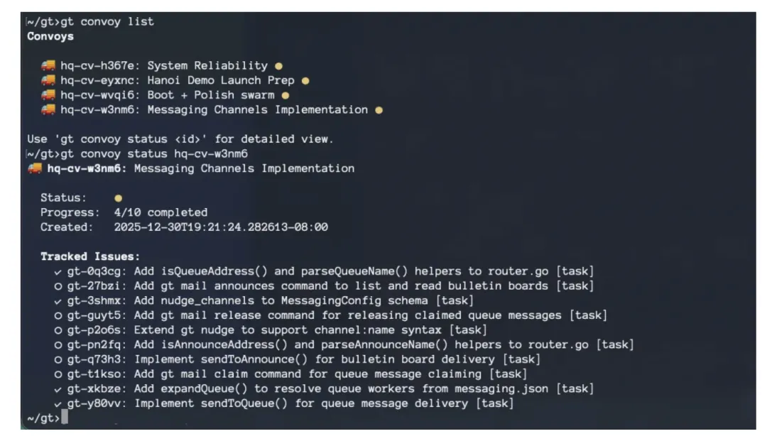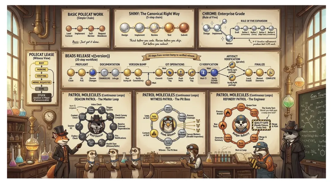 - 城镇级别工作是编排,包括巡逻(要遵循的长步骤串,编码为链接的Beads)和一次性工作流,如发布或生成跨钻机代码审查波。