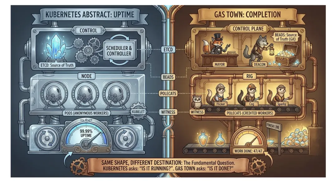 就是这样!我发誓,您不需要太多tmux。它不碍事,并且经常救您一命。它还支持远程云工作者(我们将在几天内连接),并且非常可定制。您只需要求Claude Code让tmux更好地为您工作,它就会做。它会制作任何您想要的视图,重新绑定键,制作自定义弹出窗口,无论什么。这太神奇了,几乎像一个婴儿Emacs。Gas Town需要很多燃料。它既消耗又产生汽油,或工作分子。除了保持Gas Town在轨道上,可能最困难的问题是保持它被喂食。它如此快速地消耗实施计划,以至于您必须做很多设计和计划来保持引擎被喂食。在消耗方面,您喂Gas Town史诗、问题和分子(构建的工作流)。它咀嚼它们,产生...嗯...我现在尽量保持在30个工作者以下,因为我还没有实现超大规模上的远程工作者(即将到来!),通常我只有十几个左右活跃,除非我真的在市长和见证者上努力。但是哇。有12到30个工作者,您可以在一次坐姿中烧掉巨大的工作积压,即使您使用"闪亮"或"镀铬"的polecat工作流,这些工作流做额外的代码审查和测试步骤(因此需要更长时间完成)。在生产方面,嗯,您可以使用自己的计划工具,如Spec Kit或BMAD,然后一旦您的计划就绪,要求代理将其转换为Beads史诗。如果计划足够大,您可能想要群集它,并为计划的不同部分在一个大车队中产生史诗。您可以使用公式生成工作。如果您希望每一块编码工作(或设计工作,或UX工作)都通过特定模板或工作流,您可以将其定义为分子,然后用您的编排模板"包装"或组合基础工作。我为Jeffrey Emanuel的"五法则"实现了一个公式,这是观察结果:如果您让LLM审查某物五次,每次关注不同领域,它会产生更优的结果和工件。所以您可以获取任何工作流,用五法则烹饪,它将使每个步骤被审查4次(实施计为第一次审查)。这可以生成大型工作流,可能需要数小时或数天才能完成,特别是如果您限制polecat数量以节流成本或令牌消耗。但Gas Town的好处是,一旦工作生成,您可以钩住它并自主完成。这是我承诺的Kubernetes比较。请随意跳过。图16:Kubernetes/Gas Town比较Gas Town可能确实有点意外地像Kubernetes。两个系统都为某个目标协调不可靠的工作者。两者都有控制平面(市长/执事 vs kube-scheduler/controller-manager)监视执行节点(钻机 vs 节点),每个都有本地代理(见证者 vs kubelet)监视临时工作者(Polecats vs Pods)。两者都使用整个系统协调的真相来源(Beads vs etcd)。这些显然是当您需要大规模放牧猫时出现的自然形状。最大的区别是,Kubernetes问:"它在运行吗?"而Gas Town问:"它完成了吗?"K8s优化正常运行时间——保持N个副本存活,重启崩溃的pods,永远维持期望状态。Gas Town优化完成——完成这项工作,着陆车队,然后核爆工作者并继续。K8s pods是匿名的牛;Gas Town polecats是有信用的工作者,其完成积累成CV链,而会话是牛。K8s向连续期望状态协调;Gas Town向终端目标前进。相似的引擎形状,根本不同的目的地。我想在圣诞节发布Gas Town,但错过了。它实际上直到12月29日晚上8点左右才开始工作,我意思是飞翔,就像我设想的那样。它飞了两个小时我才注意到。我一直在和市长交谈,抱怨事情,然后修复开始在我周围着陆,我意识到我只是通过交谈来塑造整个事情。车队在流动和着陆,工作在提交和审查...这是我几个月来一直瞄准的目标。我两天前才让它工作。足够发布了!- 联邦——即使是Python Gas Town也有对GCP上远程工作者的支持。我需要设计对联邦的支持,既为了扩展您自己城镇的容量,也为了链接和与其他人类城镇共享工作。