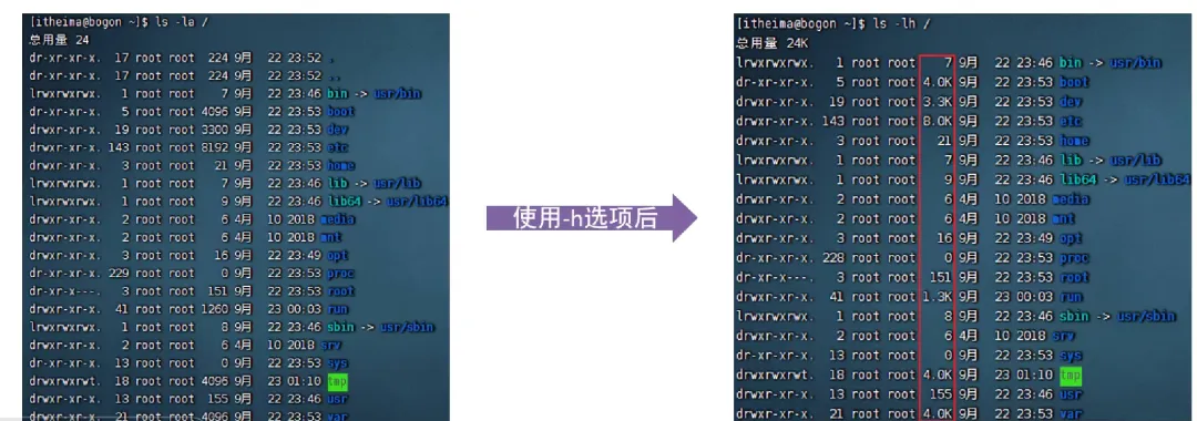 -h选项,需要和-l选项搭配使用,以更加人性化的方式显示文件的大小单位