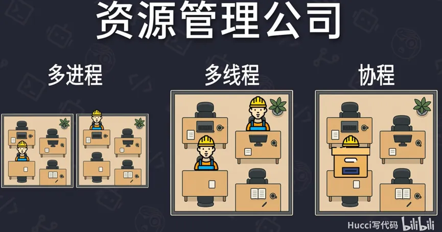 参考B站的一个UP主(Hucci)所举的一个非常形象的例子,便于读者通俗理解上述含义。假设你的操作系统是一家资源管理公司,管理着电脑上的各种资源,尤其是CPU时间还有内存。在这家资源管理公司当中,有很多个办公室,有的办公室负责微信,有的负责三角洲行动,每个办公室因此也会被分配到一定的资源,这每一间办公室就可以看作成一个进程。当然,每个办公室都要有各自的员工,最少有一个工人,这个工人就是主线程;也可以用很多工人,每个工人有各自的任务,每个人工人也就可以看成一个线程。那一个工人也可以同时负责多个小任务,比如接收消息的工人又要接收网络数据,又要处理本地缓存,他可以在网络数据还没到的时候,先处理本地缓存,数据到了再去处理网络数据。这种切换工作的方式叫做协程。所以,协程仅仅是一种工作方式、调度方式,而进程和线程是真实存在的。