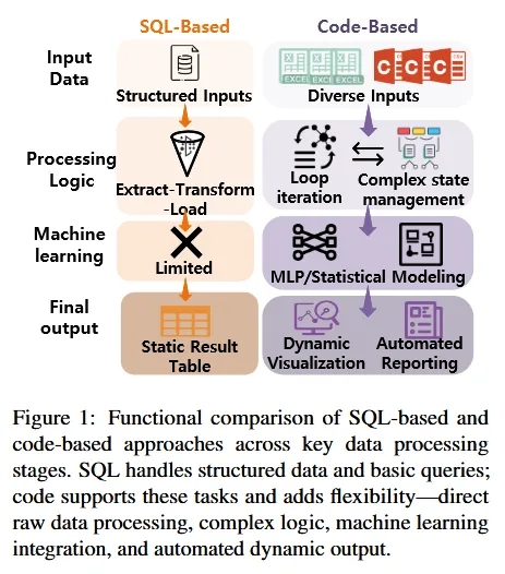 ✅ 揭示核心瓶颈:清晰地指出性能瓶颈在于上下文缺失,而非范式本身,为未来研究指明了方向。 | ❌ 理想化假设:为公平比较,Text-to-Python 任务被提供了完整的 DDL Schema,这在处理原始、无模式的文件时可能不成立。 |