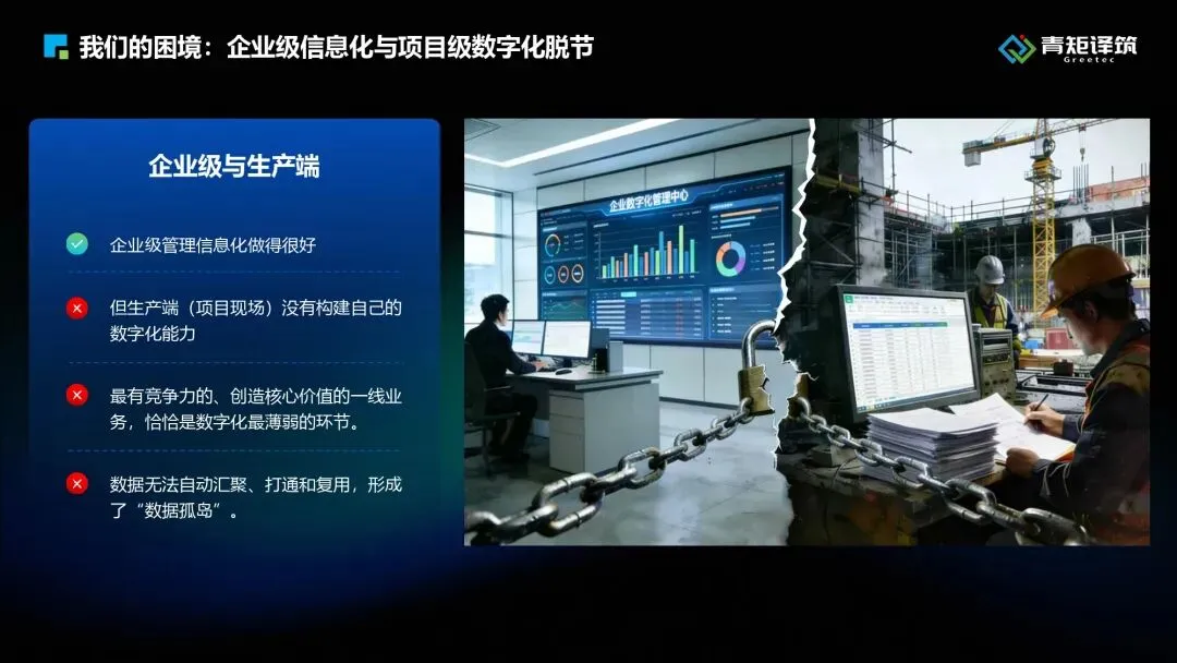 其根本原因在于工程业态复杂、项目差异大,标准化产品难以适配;而定制开发投入高、周期长,系统之间又普遍割裂,数据无法真正贯通。