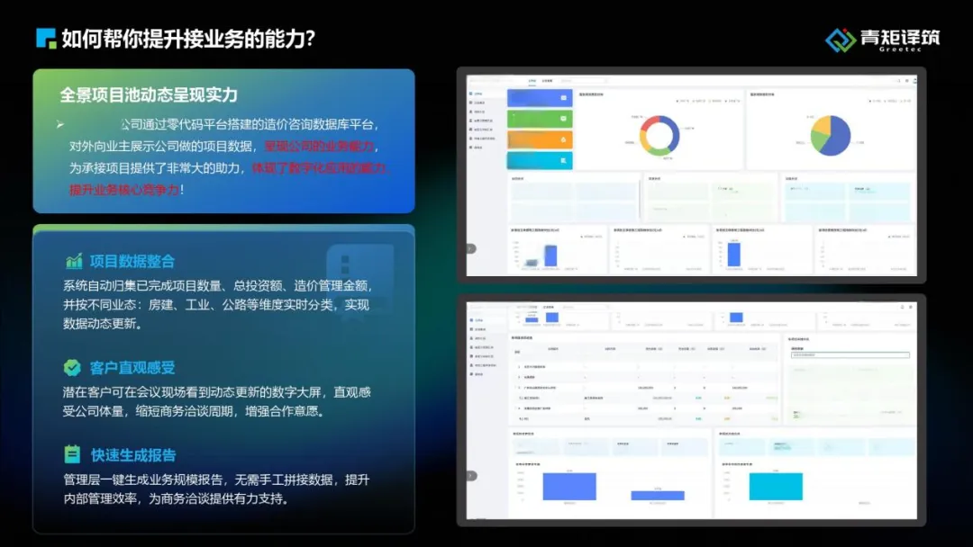 在某造价咨询公司的实践中,通过零代码平台将过往项目经验与数据进行系统化沉淀,并以平台形式对外展示,使业务能力从“口头介绍”转为“数据可视”。