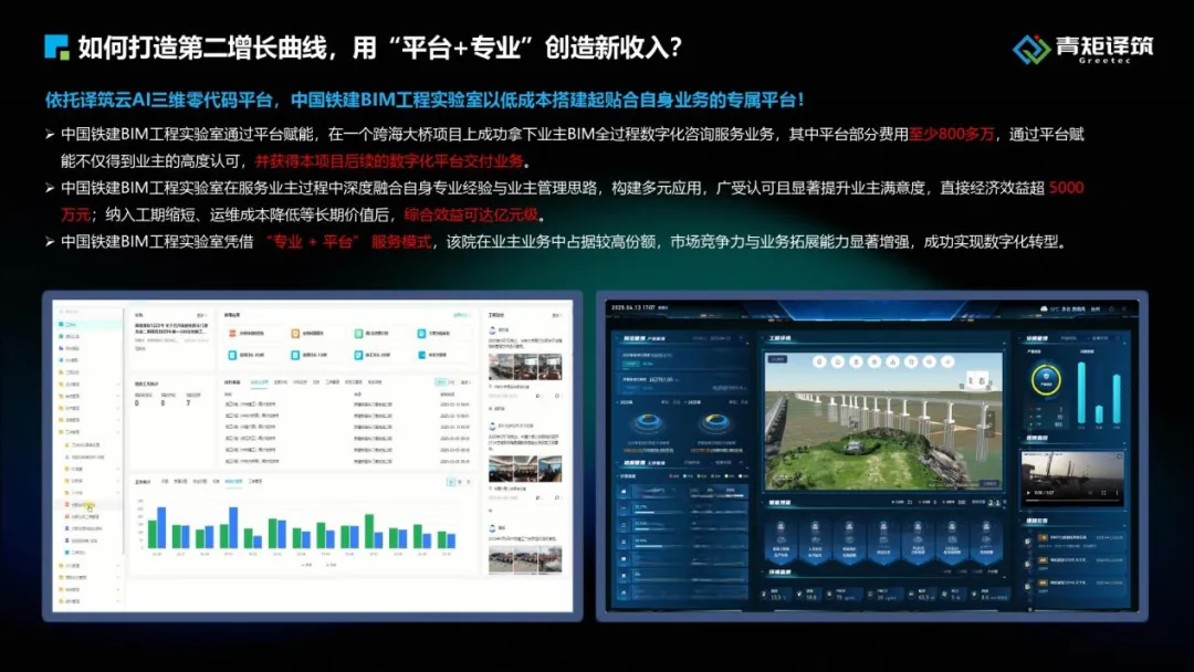 到 2025 年,我们正式推出青矩译筑 · 译筑云 AI 三维零代码平台,开始用零代码的方式支撑施工、咨询等多类工程业务场景。