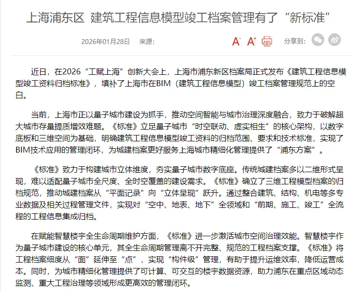 BIM(建筑信息模型)技术已走过单一建模阶段,正朝着全专业、全流程、全参与方协同的方向演进。上海浦东将BIM模型作为法定竣工档案交付,其深远意义在于:首次在法律和行政层面,认可了数字模型与物理实体具有同等的档案价值。这为未来城市的数字孪生管理、建筑的智慧运维铺平了道路。数据,正成为比钢筋混凝土更重要的资产。