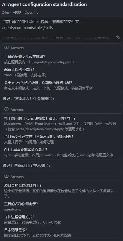 交互的方式很多,直接对话,或者让它写一个 Q&A 的 markdown,你来填答案。但我还要推荐给你一个更方便的交互,就是 Agent 自带的问答工具。没错,就是你在 Claude Code 或者 Cursor 中使用 plan 模式时的那个,很多人大概就是在 plan 的时候用过,但没有意识到「我们可以主动调用 AskQuestionTool」