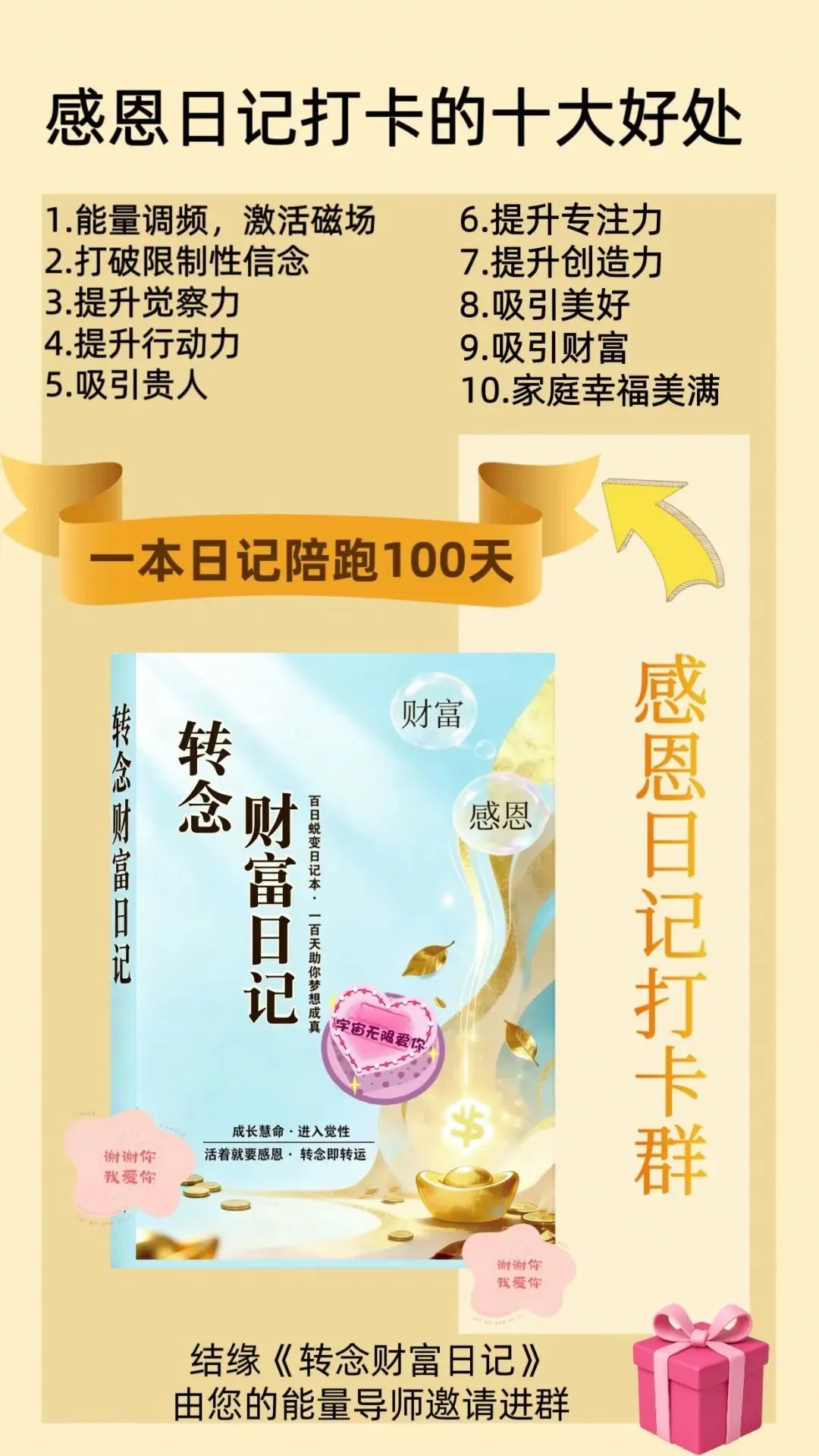 “我感恩每一分钱,它们是我通向更丰盛的垫脚石。”开始写感恩日记吧,哪怕今天只收入10元,也真诚感谢它。感恩是最高的财富频率。