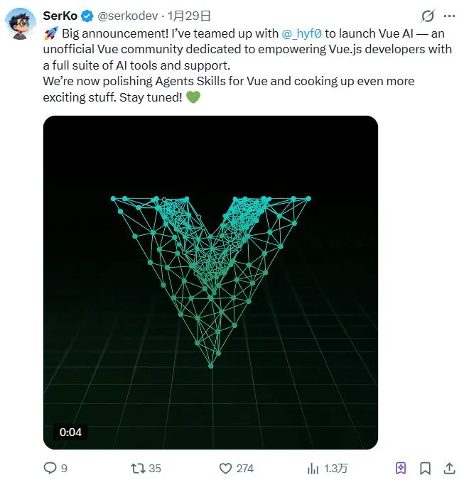 昨天,Serko (@serkodev) 正式宣布与 @hyf0 联手推出全新项目:Vue AI —— 一个专为 Vue.js 开发者打造的 AI 社区与工具生态。