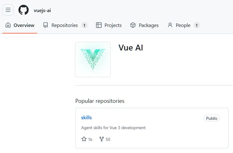 目前,Vue AI 团队已开放首个核心仓库:vuejs-ai/skills。