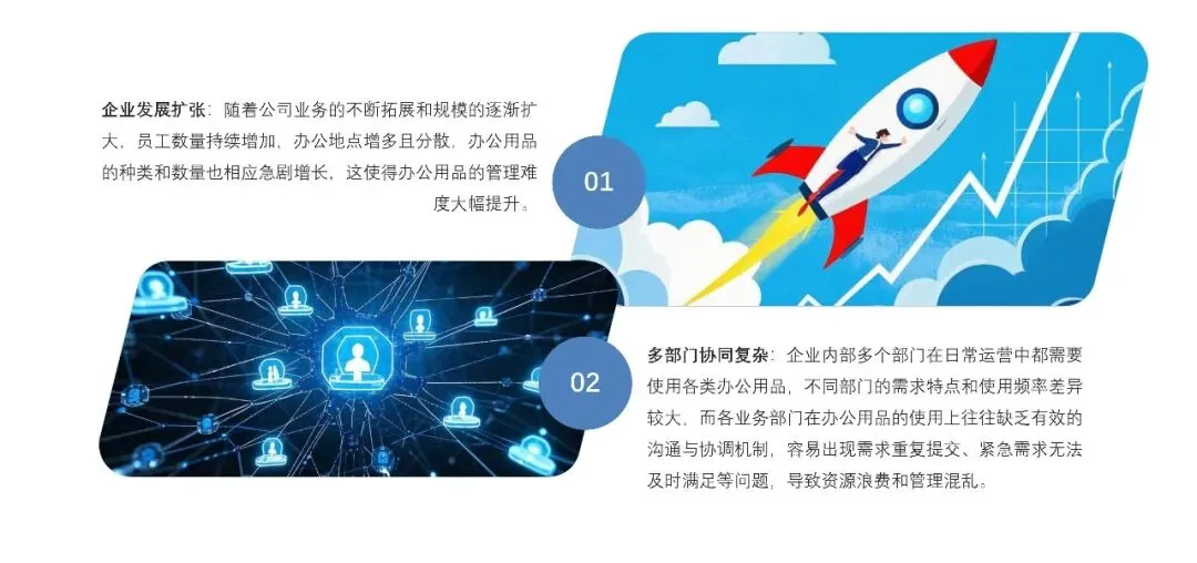 企业发展过程中,办公用品管理压力凸显。员工增多、办公地点分散,导致用品种类及数量激增,管理难度加大;多部门需求差异大且缺乏协同机制,易出现需求重复提交、紧急需求响应滞后问题,影响办公效率。