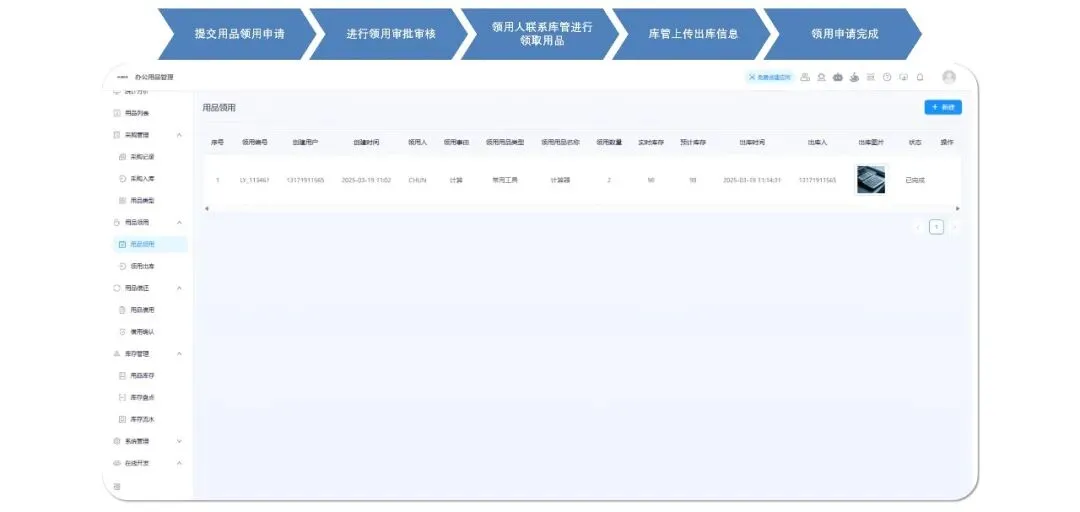 严格遵循“申请→审核→领取→出库→完成”的标准化流程,每一步操作均在线上留痕,规范领用流程的同时,便于后续信息追溯,减少流程内耗。用品借用管理
