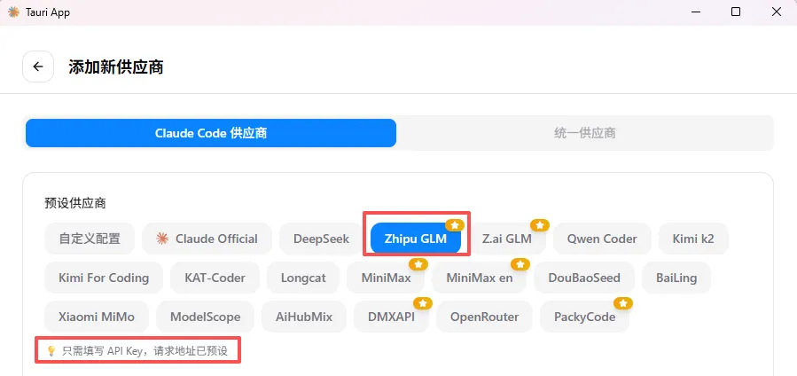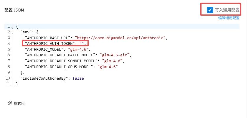 下载安装完成后,新增模型供应商即可,如:Zhipu GLM,只需要填写模型的API Key,切记如下图中:“写入通用配置”记得勾选。- 命令:npm install -g @anthropic-ai/claude-code@2.0.37 --registry=https://registry.npmmirror.com