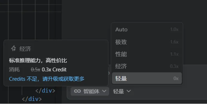 在模型下面,只能选择轻量/经济/性能/极致/auto,但是背后是什么模型,你不知道。也改不了。
