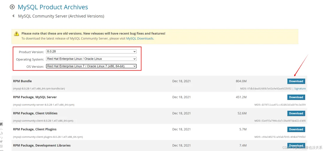 根据你服务器的配置选择,我服务器是 CentOS 7 所以 Operating System 选择 Red Hat Enterprise Linux / Oracle Linux ,OS Version 选择 Red Hat Enterprise Linux 7 / Oracle Linux 7 (x86,64-bit),选择第一个点击 Download 下载。