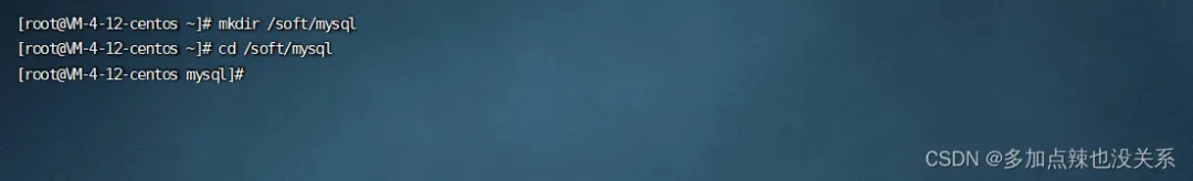 # 在 /soft 目录下创建一个空的文件夹 mysqlmkdir /soft/mysql# 进入这个新建的文件夹下cd /soft/mysql