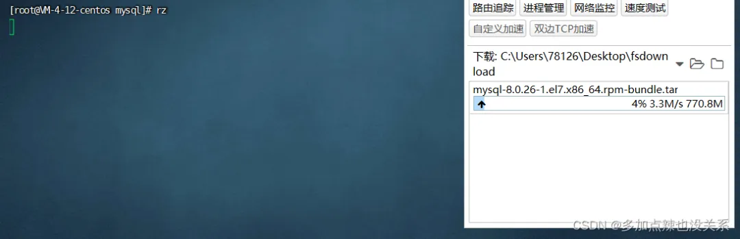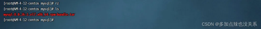 然后上传之前下载好的 Linux 下 MySQL 的安装包,使用 rz 命令(有些终端工具是可以直接上传文件的,比如 FinalShell)。