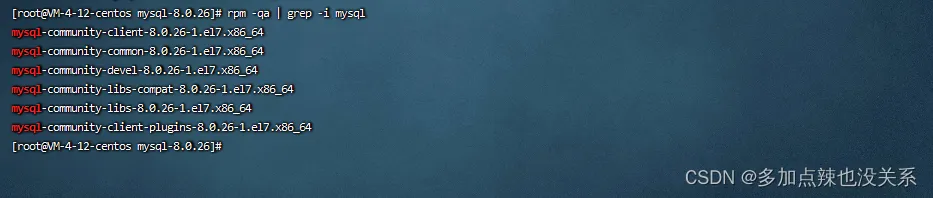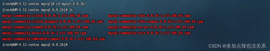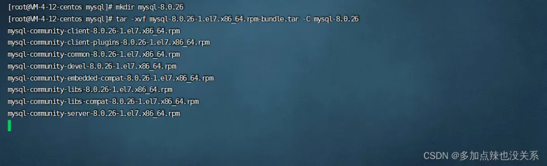 # 在当前目录下(mysql)下创建一个 mysql-8.0.26 文件夹mkdir mysql-8.0.26# 解压安装包到该目录下tar -xvf mysql-8.0.26-1.el7.x86_64.rpm-bundle.tar -C mysql-8.0.26