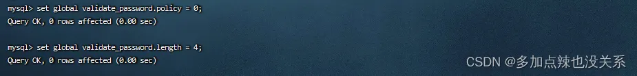 # 将密码复杂度校验调整简单类型setglobal validate_password.policy = 0;# 设置密码最少位数限制为 4 位setglobal validate_password.length = 4;