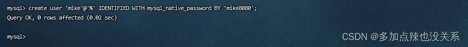 # mysql 8.0 以下createuser'mike'@'%'IDENTIFIEDBY'mike8080';# mysql 8.0createuser'mike'@'%'IDENTIFIEDWITH mysql_native_password BY'mike8080';PS:mysql8.0 的默认密码验证不再是 password 。所以在创建用户时,create user ‘username’@‘%’ identified by ‘password’; 客户端是无法连接服务的,所以在创建用户的时候需要加上 WITH mysql_native_password