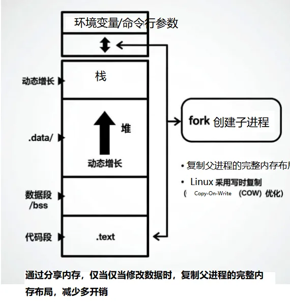 fork创建子进程时,会复制父进程的内存布局(Linux实际采用写时复制(Copy-On-Write,COW) 优化:默认共享内存,仅当父/子进程修改数据时,才会真正复制对应内存页,减少内存开销)。