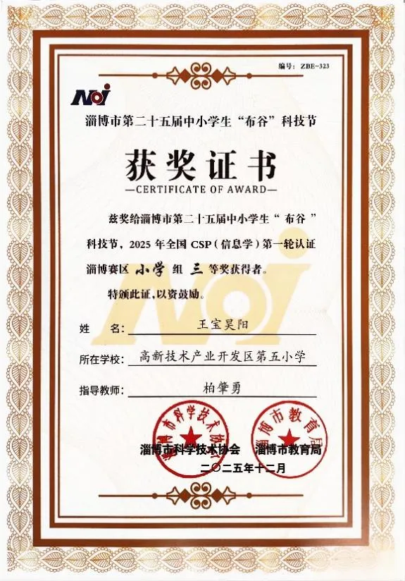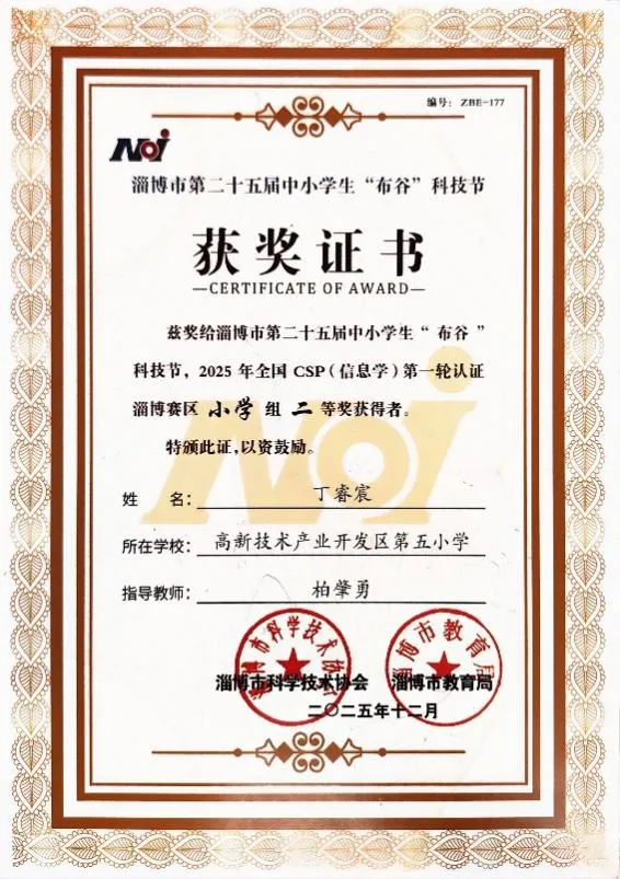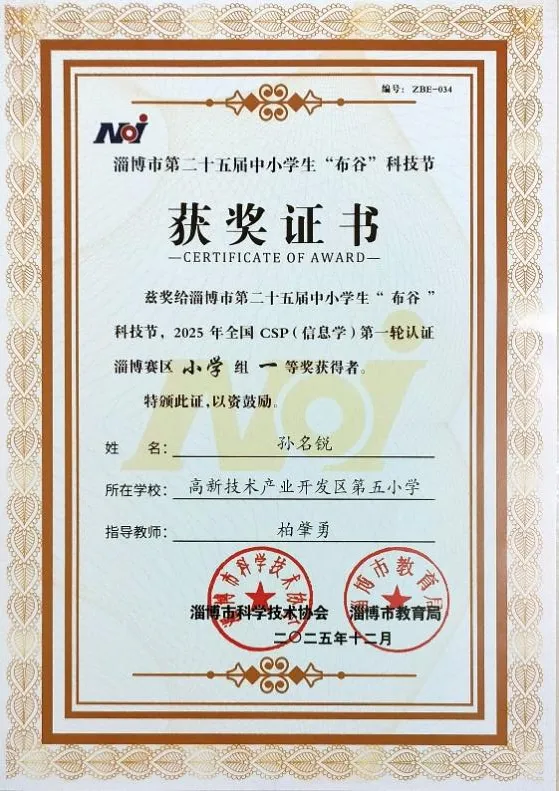在2025年全国csp(信息学)第一轮认证淄博赛区小学组比赛中,孙名锐和丁睿晨两位同学获得一、二等奖,刘恒宇和王宝昊阳获得三等奖。在人才济济的市赛中,我们的学员能够获得荣誉,是我们社团前进的一小步,未来我们要在更大的舞台上展示自己,同台竞技,获得更多的收获!