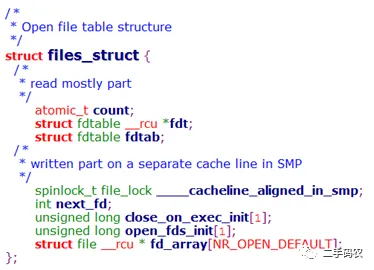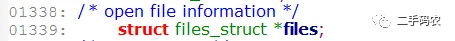 进程在Linux内核中是由结构体task_struct维护,进程打开的所有文件描述符都在进程维护的结构体task_struct的files变量中维护: