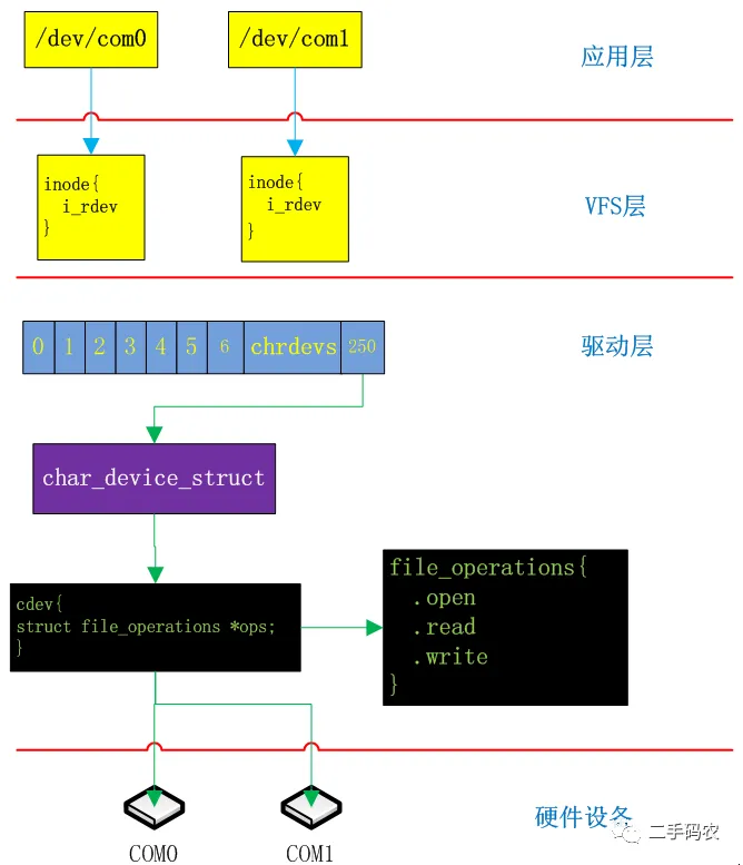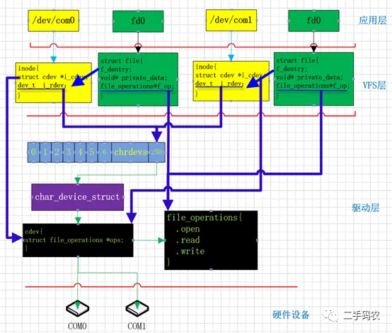 由上图所示,创建字符设备 /dev/com0、 /dev/com1,只是增加了对应的inode节点,此时VFS层并没有并没有创建file结构体,而且inode和驱动也并没有产生联系。