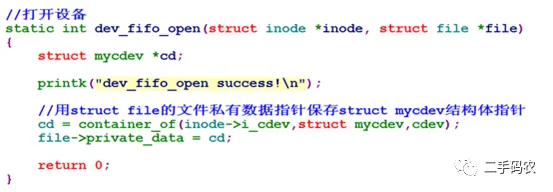 字符设备架构调用我们注册的接口函数open会传递参数inode和file,inode->i_cdev指向了我们注册的pmydev[i]->cdev,在open中通过inode->cdev来识别具体的设备,通过container_of来找到对应的pmycdev结构体变量,并将其私有数据隐藏到file结构的private_data中,进而识别同一个驱动操作一类设备。